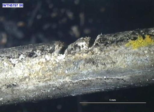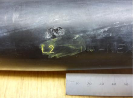 The damage appeared only in the area of the hang off location (not repeated at other areas of the inspected conductor sheaths), so it was likely this damage occurred during the installation of the temporary hang-off. This was further supported by the Microscopy report which showed damage to the armour wires which had been notched by a blade of around 1mm thickness in this location.